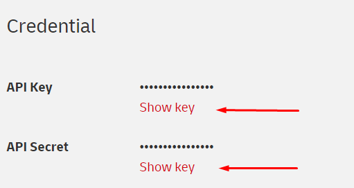 • Click on Show Key next to API Key and API Secret to reveal the credentials.